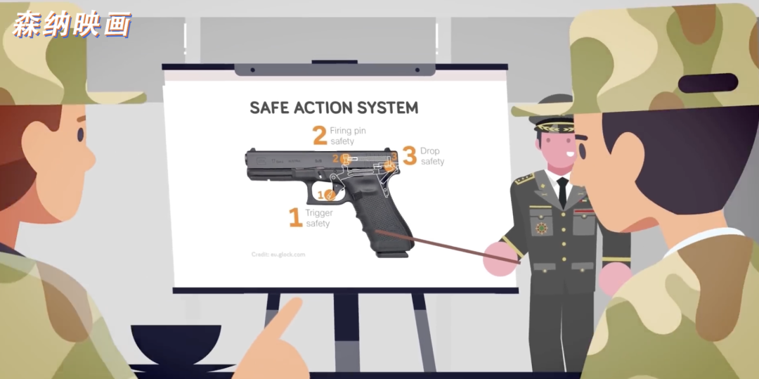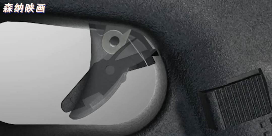 第一个就是没有外置击锤,大家看像伯莱塔M9,M1911等手枪就有明显的外置击锤,经常电影中遇上对峙的局面,角色还会手动扳起外置击锤来增加“震慑度”。而格洛克就没有击锤,它采用的是内置击针的方式来击发弹药底火。