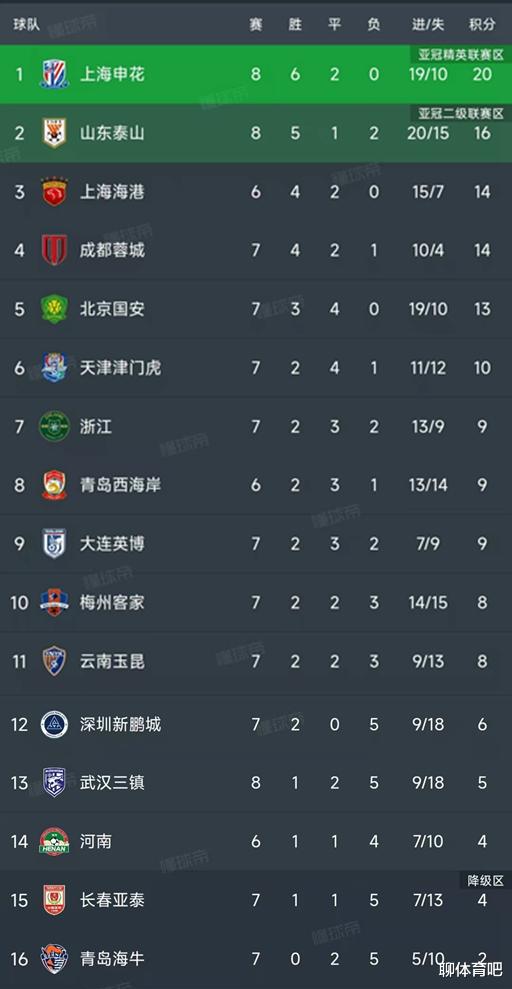 申花以6胜2平积20分稳居第一,三镇遭遇赛季第5场败仗,以1胜2平5负积5分排在倒数第4,只领先降级区1分,保级任重而道远。