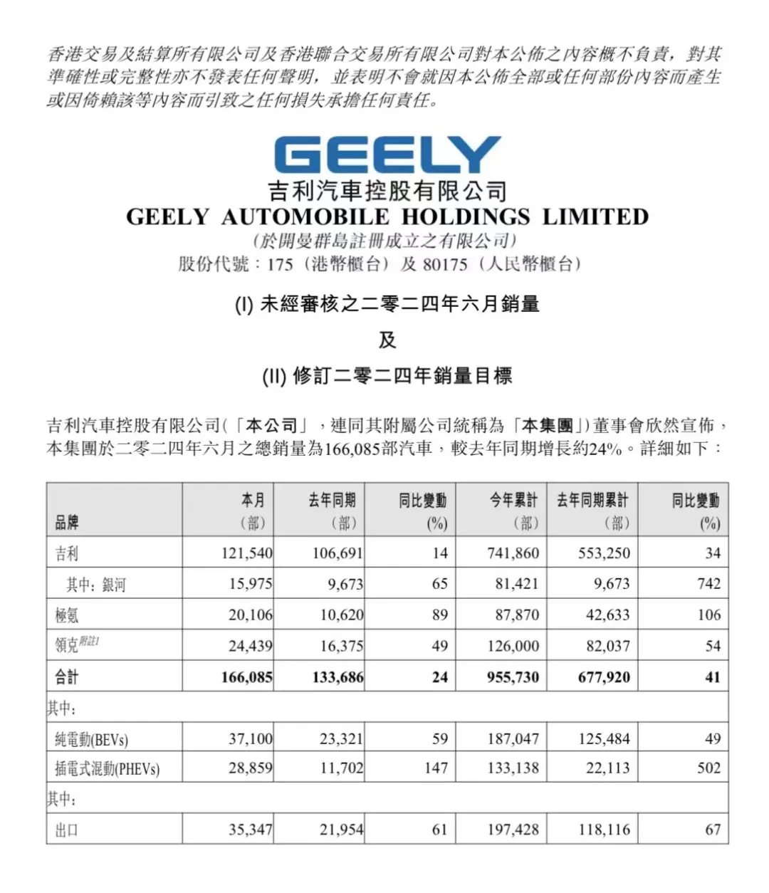 在今年6月,吉利汽车共销售166,085辆汽车,较去年同期增长约24%;1-6月累计销量741,860辆,同比增长34%。从各子品牌来看,今年上半年银河增长742%,极氪增长106%,领克增长54%,连只卖油车的吉利品牌也增长了34%。在这种背景下,吉利宣布将2024年的销量目标提升5%,达到200万辆。这也是今年唯一一个提升销量目标的车企。