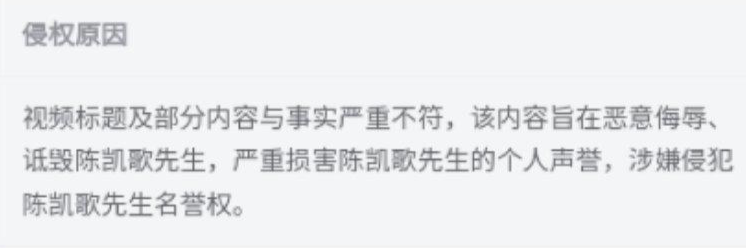 有up主晒出了自己收到的侵权投诉截图,显示的侵权原因为:“该内容旨在恶意侮辱、诋毁陈凯歌先生,严重损害陈凯歌先生的个人声誉,涉嫌侵犯陈凯歌先生名誉权”。