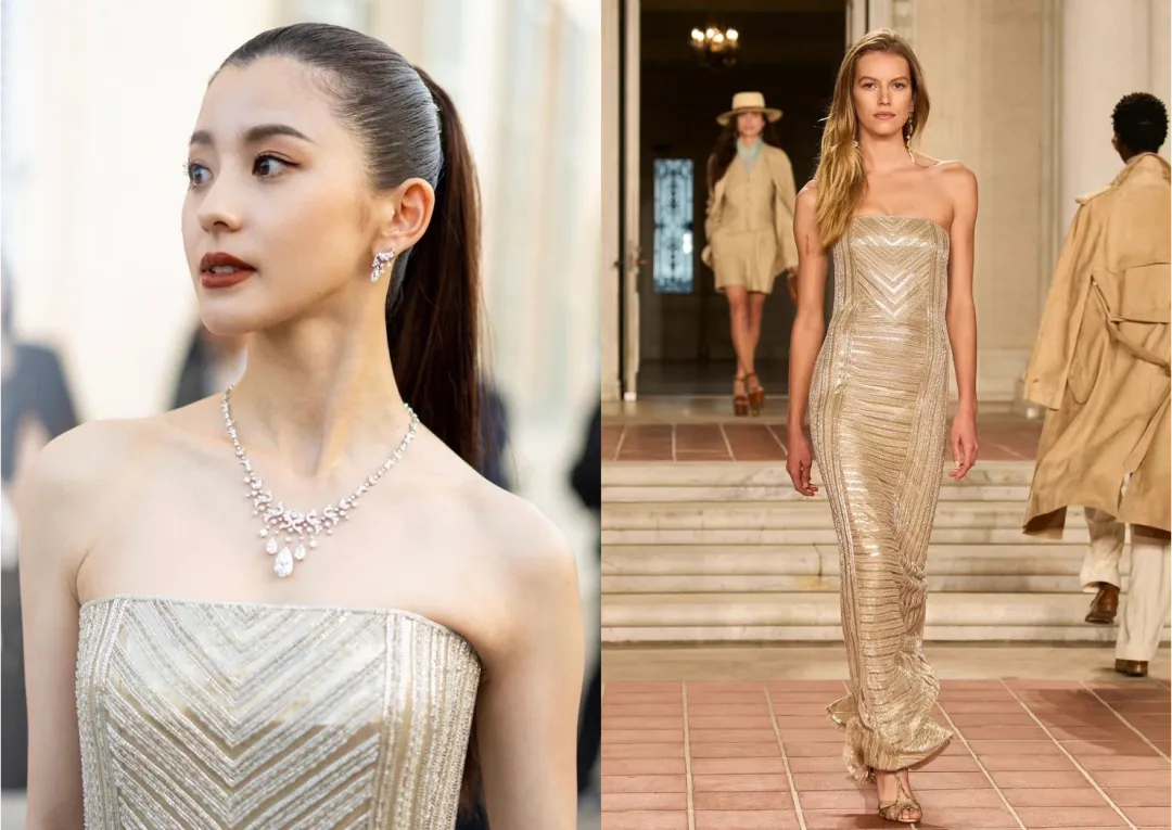 一条Ralph Lauren礼裙,既穿出了剪裁版型本身的典雅女人味,又因为线性金色碎闪的细节为整体增添凛冽的先锋美感。