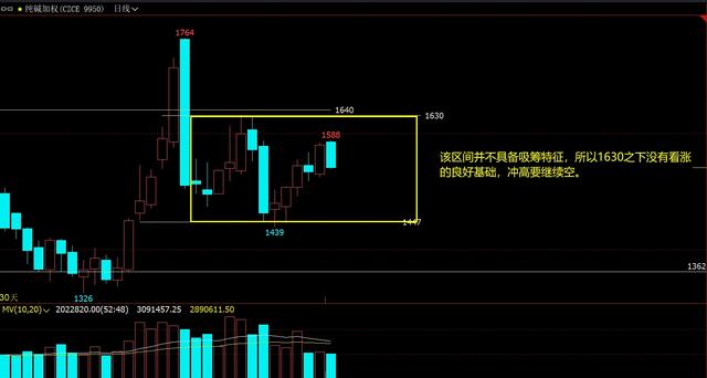 纯碱近期的走势我个人感觉是比较难把握的,一般一次机会要不要把握,是要看懂市场大概率的运行的内涵逻辑,还要去对比图表上的表现特点,我们反复在提示涨的不健康,但盘面天天拉个光头阳线给你看,风控不好做,入场点不理想,就只能等。