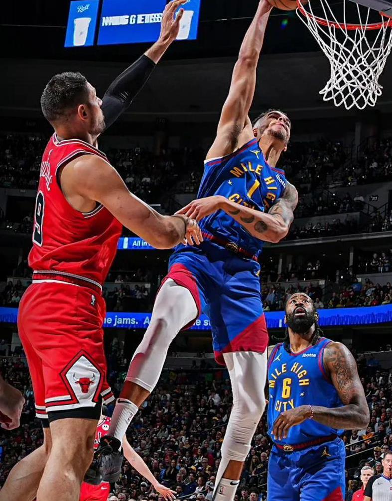 公牛掀起进攻高潮拉开比分末节开始,小波特连续得了4分,结果公牛马上回敬了一波7比0,直接把掘金打停了。暂停回来,掘金好像也没什么太好的办法,虽然自己也能得分,但就是防不住公牛的进攻,就这么你来我往地耗着时间。这时候特里突然站了出来,成了板凳上的奇兵,而吉迪也在弧顶接连命中三分球。公牛越打越顺,外线火力全开,直接把分差拉开到了两位数。