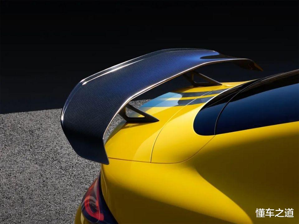 车身尾部,配备大尺寸碳纤维固定式扰流板,尾部标识都进行了黑化处理,配备有尾部主动扩散器,后包围造型也十分独特。