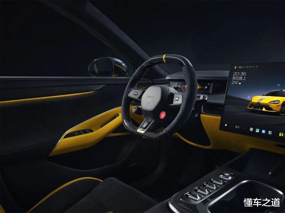 外观上,作为Ultra版,前包围两侧采用与车身同色的U形风刀,前包围中间位置搭配前铲和菱形网格结构进风口。新车针对前车标、前大灯采用黑化处理,并在前机舱盖、后备厢盖中间位置加入银色涂装。并且车身多处更是增加了空气动力学套件,全车17处碳纤维材质,整体的空气动力学设计能提供最大285kg的下压力,车顶保留有激光雷达,整车采用黄色涂装。