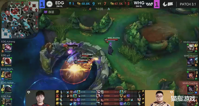 在双方的第三局对局里面,EDG已经把握住了游戏的节奏,按着EDG的节奏走,这一局比赛的胜负自然很容易分晓。在这样的情况下,WHG是非常无奈的,选择打大龙影响一下EDG的节奏。结果EDG在有视野的情况下,甚至没有检查一下大龙坑的动静。那WHG自然不会客气,迅速拿龙,让本局对局出现了变数。