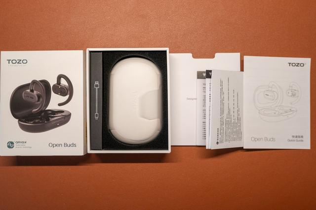 简约外观,舒适佩戴。开箱后我也好好欣赏了一下TOZO Open的外观,先说说盒子,盒子体积并不算小,但是考虑到开放式耳机本身的体积,盒子设计也算是紧凑,盒子正面是TOZO的LOGO,底部则是产品特点与许可证等等,采用目前市面上主流的USB-C接口。盒子开口处有做内陷设计,并且在上盖与底部中间用了灰色拼接,配合接合处的弹簧轴承可以轻松打开和关闭盒子。