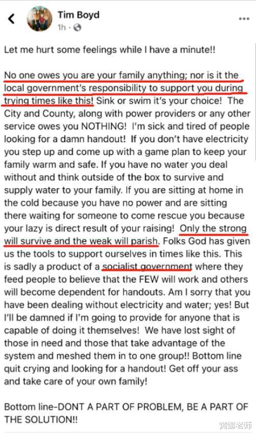 这是2021年美国冰雪灾害时,德州某位市长的发的推文,大意为:供电局不欠你们,政府也没有责任和义务去救援你们。你得学会自救,只有强者才能生存下来,救援是社会主义国家才能做的事。