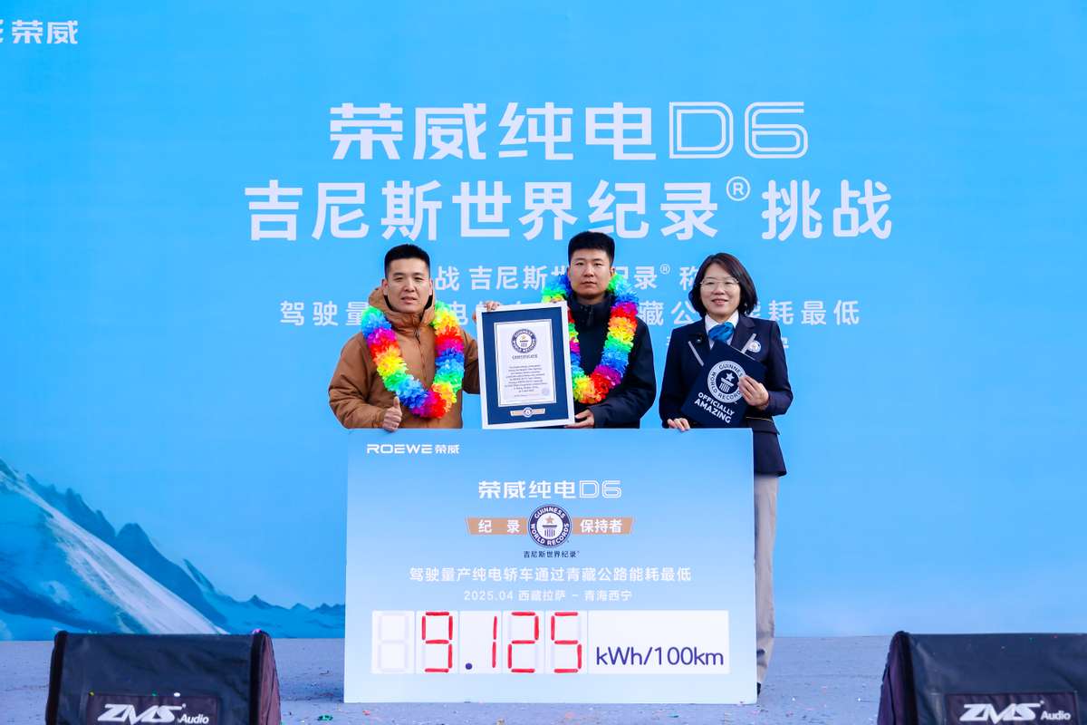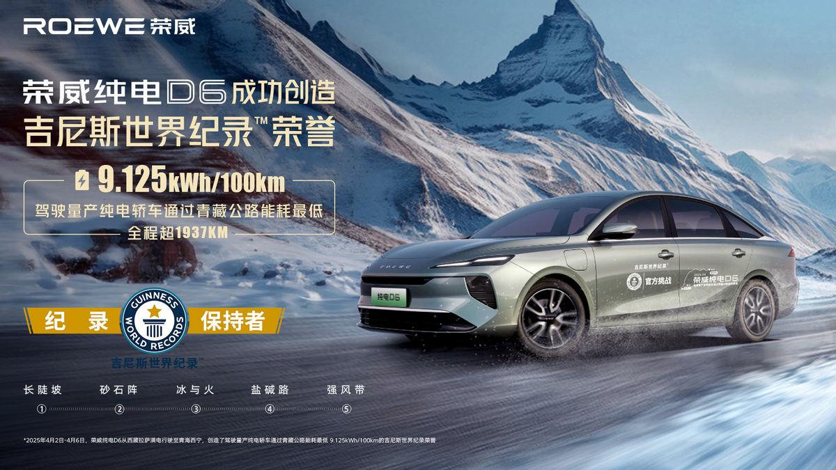 近日,在全球公认的权威认证机构吉尼斯的全程公证下,上汽荣威纯电D6以9.125kWh/100km的电耗获得“驾驶量产纯电轿车通过青藏公路能耗最低”的吉尼斯世界纪录,代表中国纯电车登临世界之巅。