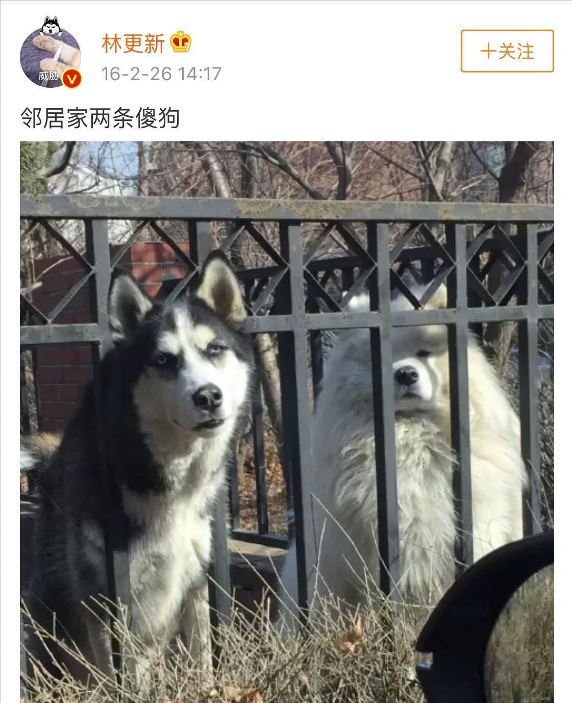 2016年,林更新在社交平台上晒出邻居家的两只狗。