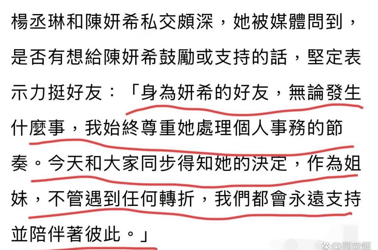 在陈妍希身旁的杨丞琳极为惹眼。一件灰白色的大衣包裹着她那纤瘦的身躯,她静静地站在距离闺蜜三步远的地方,等待对方处理事务。这份深厚的默契,起始于 2007 年拍摄《换换爱》时在片场的首次碰面。十七载岁月悠悠,把曾经的同事变成了知心好友。当年陈晓与陈妍希举办婚礼之际,杨丞琳是以眼含热泪却面带笑容的见证者身份出席;如今二人婚姻走向终结,她又成为最早赶来陪伴陈妍希的人。面对媒体的追问,她说出的那句“尊重其决定,会随时陪伴左右”,远比无数言语都更具分量。