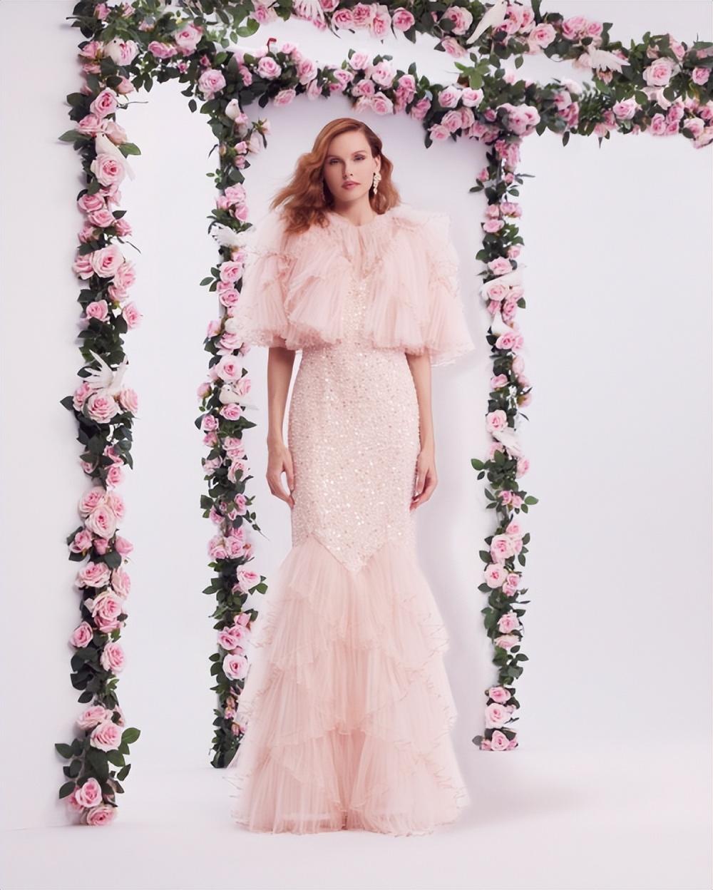鸽子在微风中轻松自在地飞翔,在那里,花朵在岩石的裂缝中绽放,玫瑰在栅栏上翻滚,休眠的蓓蕾破土而出。这些新的开始和希望之花转化为由刺绣网布剪裁而成的及地长裙,上面布满了绘画般的精美贴花。