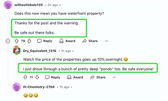 也有人提醒在附近的人们:“我刚刚也开过一堆很深的‘池塘’。大家注意安全!”