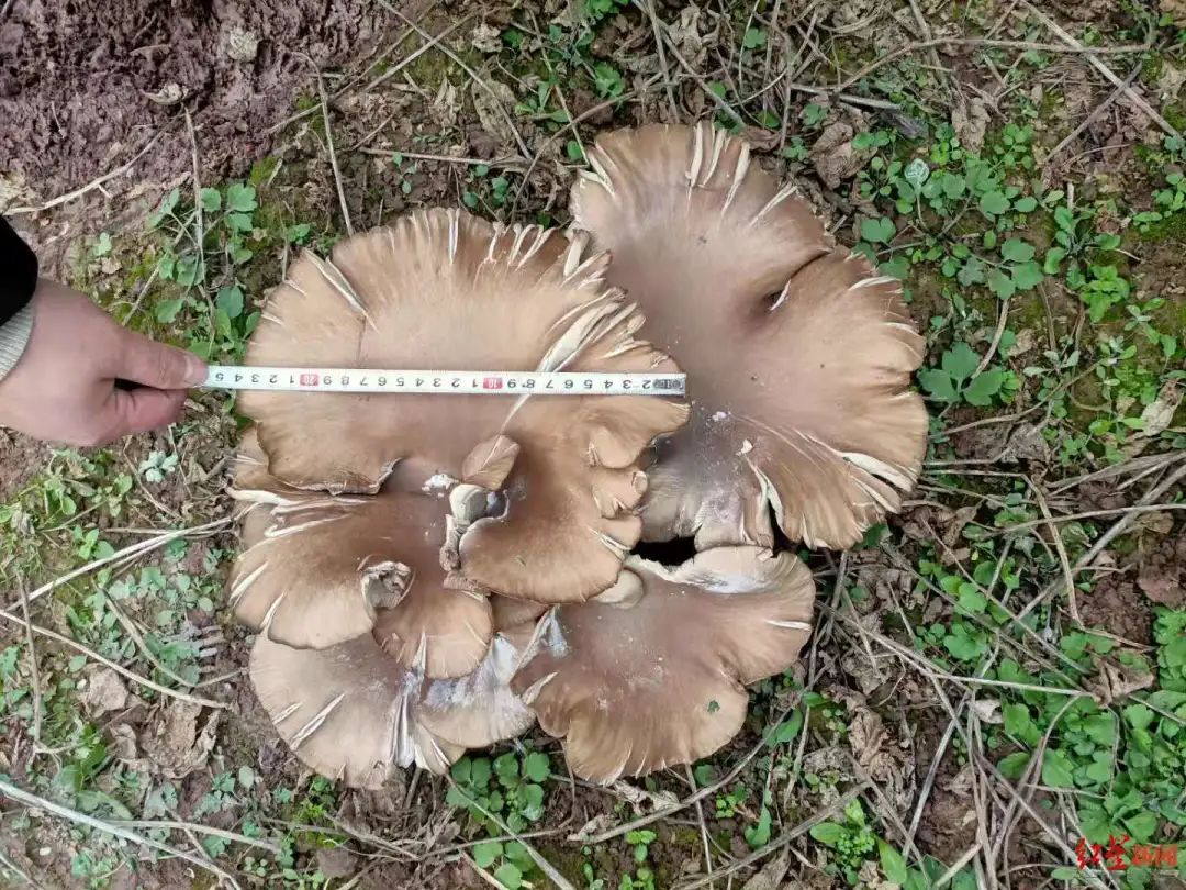 近日,四川广安武胜县赛马镇的一个村子里,一位村民在柑橘园里除草施肥时,意外发现一朵直径24厘米左右的大蘑菇,比平时看到的蘑菇体型要大一倍左右。村民表示,因之前从未发现过这么大的蘑菇,联想到经常看到食用野生蘑菇中毒的新闻,也不敢吃。
