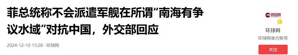 《菲总统称不会派遣军舰在所谓“南海有争议水域”对抗中国,外交部回应》——环球网