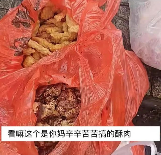 服务区的清洁工在垃圾箱里碰到了一袋袋包装完好的腊肉、排骨,以及炸得金黄的小酥肉,还有一些新鲜的蔬菜。粗略估计有近百斤,价值千元。
