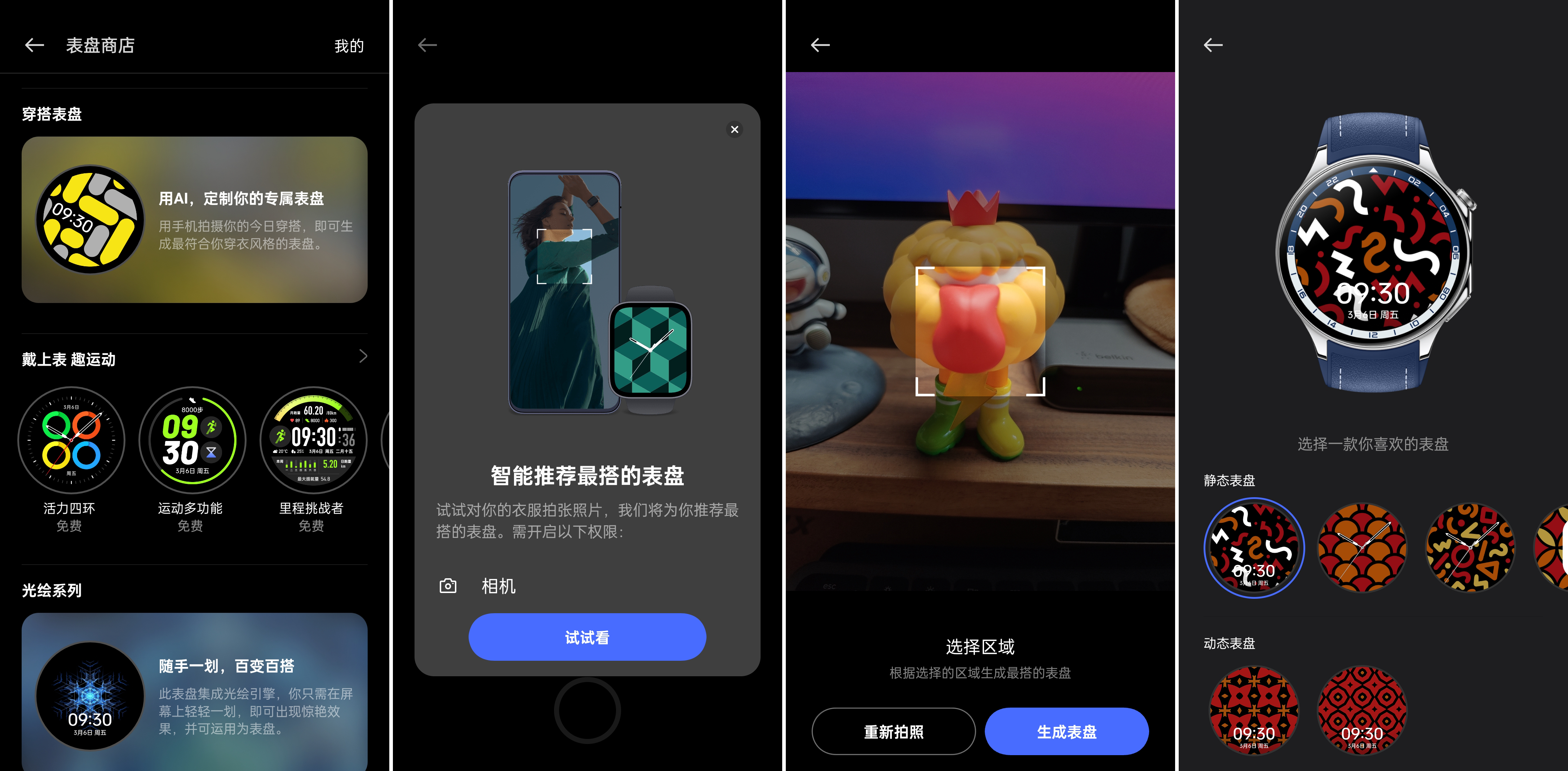 例如调用“穿搭表盘”功能后,我们只需用手机对着任意物件拍一张,然后根据框选区域,OPPO Watch X会通过AI算法生成与之相匹配的表盘。每天依据穿着来成生表盘图案,与时尚结合为一体,生活每天都不重样。