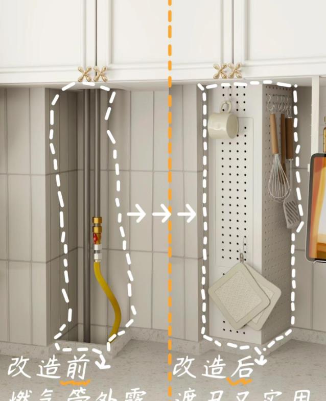 其实对于热水器的管子等必须要有的东西,日本人在厨房设计时也想到了,这些又不能全部封闭,还要为了安全考虑,所以就用洞洞板来代替柜子了。