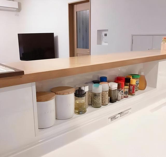 日本人会习惯在厨房里做一个探入式的收纳柜,厨房里需要用到的小东西或是不常用的锅碗餐具,通通可以进到这里收纳起来。