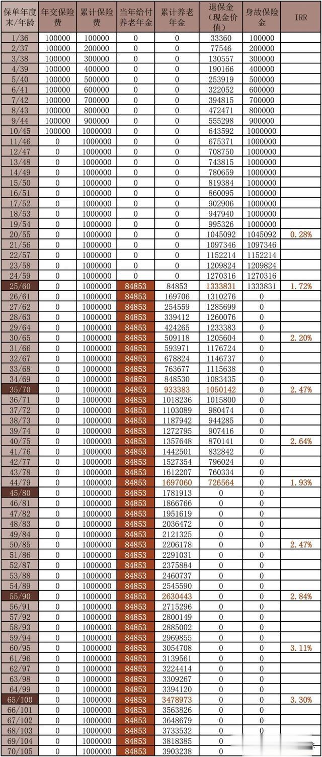 以35岁男性为例,每年交10万,交10年,60岁开始领取,总保费100万,保到领取20年