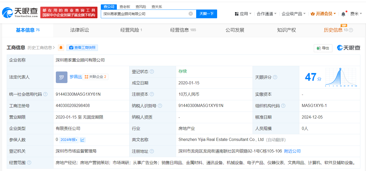 天眼查经营风险信息显示,近日,深圳易家置业顾问有限公司因通过登记的住所或者经营场所无法联系,被深圳市市场监督管理局龙岗监管局列入经营异常名录。