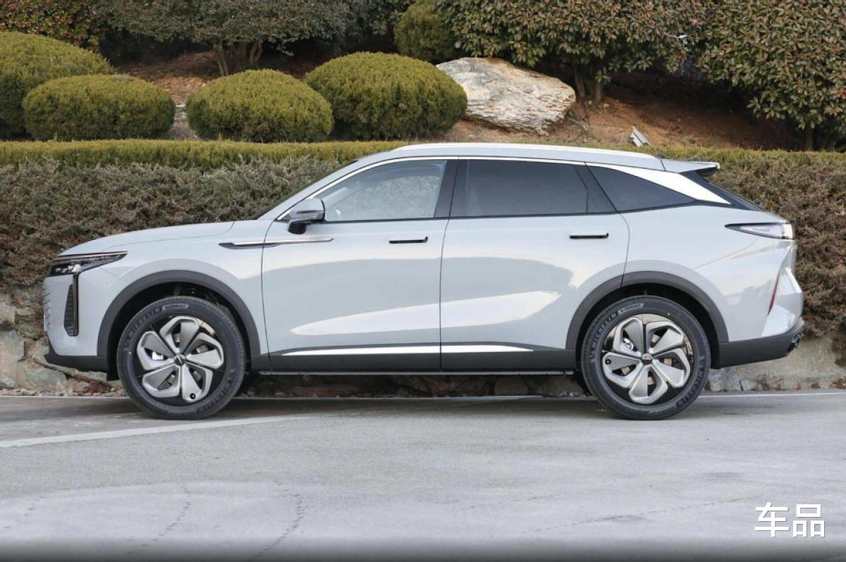 车侧采用了更具运动气质的轿跑SUV造型,车顶线条从A柱末端就开始形成逐步下沉的走向,与较大倾角的尾柱形成类似溜背的型面组合,车身的腰线和型面的组合则兼顾了优雅与力量感两方面,一条平直的折角腰线从头灯区域延伸到尾灯,在A柱下方的区域还带有银色饰条的装饰,隐藏式门把手提升了整体的时尚度,侧裙上方上扬的裙线勾勒则让车身更具有光影立体感。