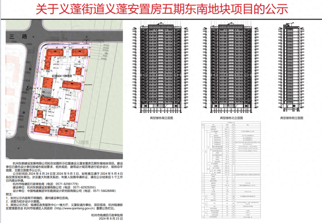 关于义蓬安置房五期东南地块项目的公示杭州东朗建设发展有限公司拟在如图所示位置建设义蓬安置房五期东南地块项目。建设单位已委托设计单位按城市规划要求、相关规定、建筑设计规范等进行初步设计,现将总平面图、主图立面图予以公示。公示时间自2024年8月24日至2024年9月3日,如有意见请于2024年9月4日前反馈至相关单位。涉及重大利害关系的,利害人如需申请听证,请在公示结束后5个工作日内提出申请。