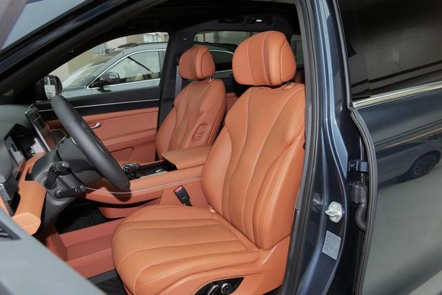 在座椅的设计上,问界M7是传统的分体式头枕,座椅材质为真皮材质,内部填充物厚实,坐上去对于腿部有着不错的支撑性,同时靠背的侧翼对于身体也有着不错的包裹性,座椅支持加热、通风、按摩,配置表现不错。