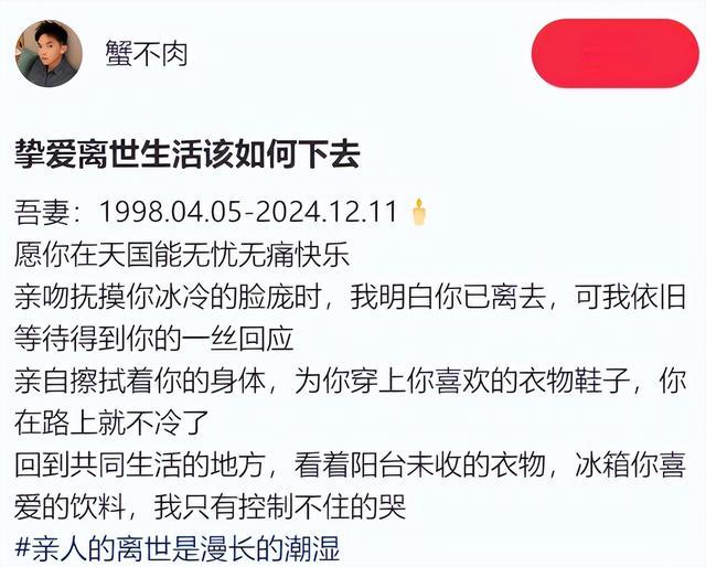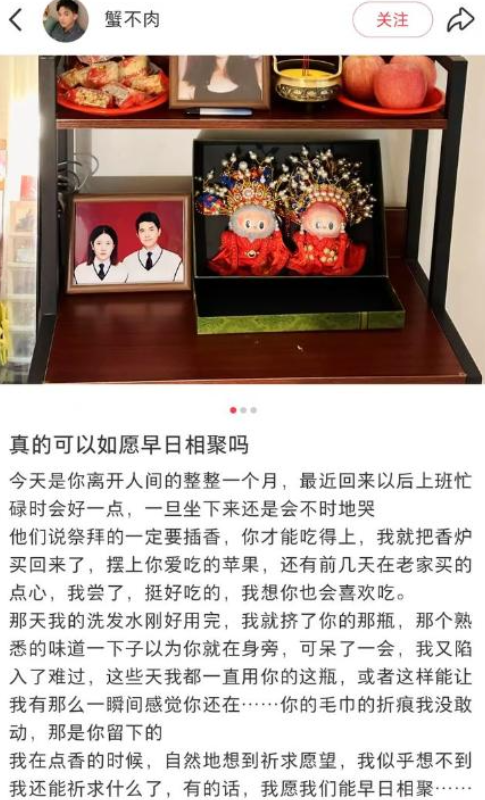 饭做好之后,他小心翼翼地端到妻子的遗像前,摆好碗筷,在社交平台上,他倾诉着:“我一直觉得你还在,从未离开。”“留下来的人的痛苦,到底有没有尽头啊?”字里行间,满是对现实的抗拒。