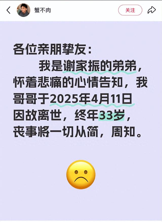 发帖人称,自己是谢家振的弟弟,自己的哥哥在4月11日的时候离开了,终年33岁,丧事一切从简。