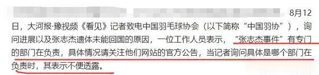 中国羽协回应8月12日,大河报·豫视频《看见》栏目记者就羽毛球新星张志杰遗体回国进展及原因。