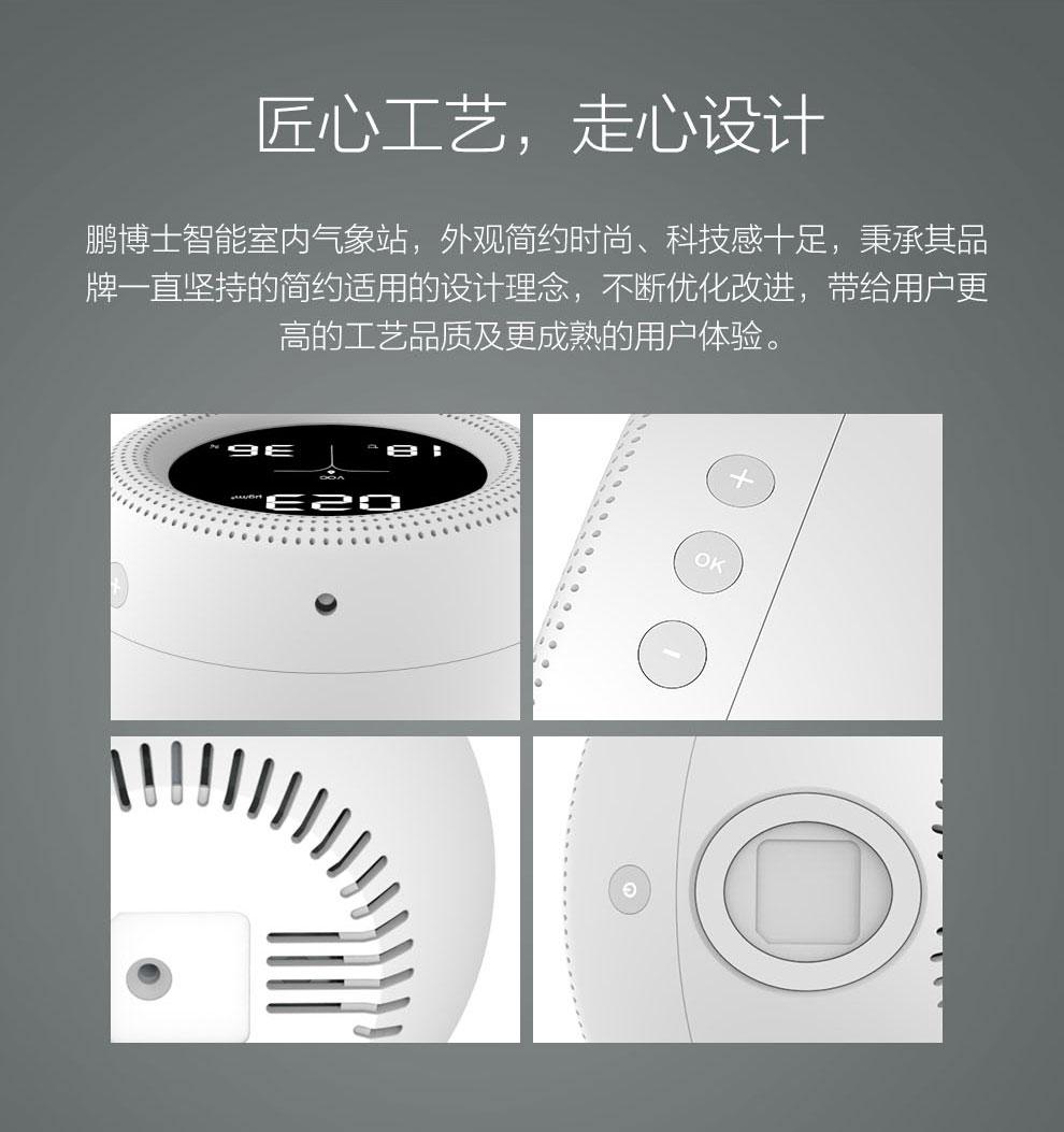 一件好产品不仅仅要有优秀的功能体验,更需要有良好的做工环节。鹏博士智能室内环境气象站外观设计简约时尚,可以说是一件白搭产品,无时无刻不透漏着科技气息。