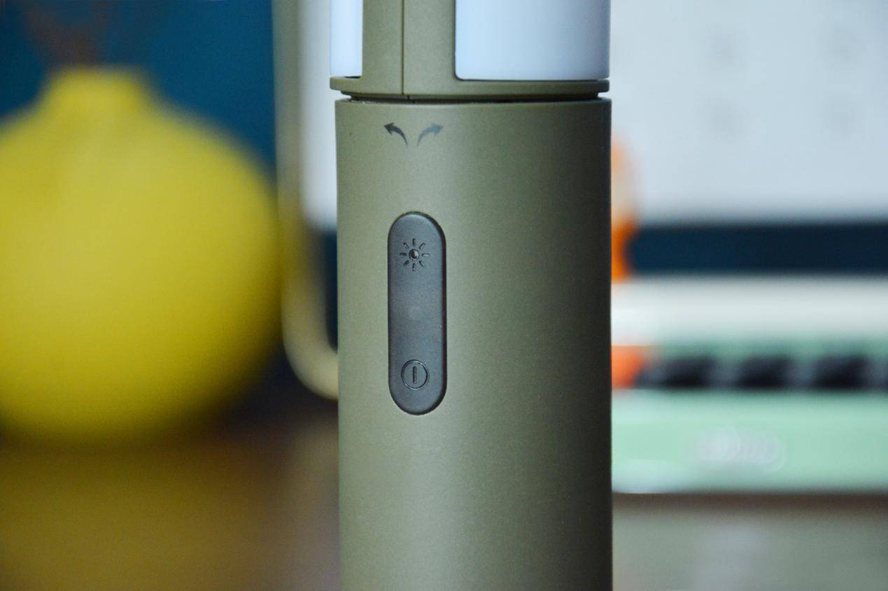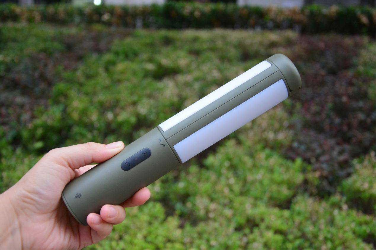 机身上半部分白色区域,就是灯源灯罩照明区,下半部分绿色握持区设计了开关、调节按钮,握拿的同时单手即可便捷操作。值得一提的是,在尾端它还内置有三颗灯珠,也可以照明发亮作为小手电使用。