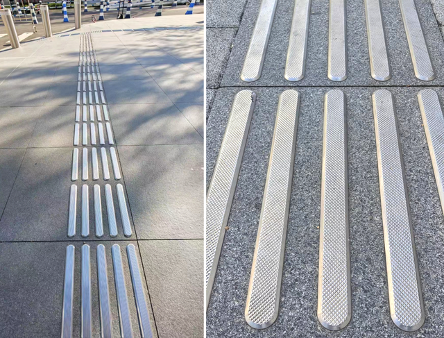 综合上述国内外无障碍规范得出结果是,不锈钢材料是可用作盲道设计使用,但是必须具备防滑要求。