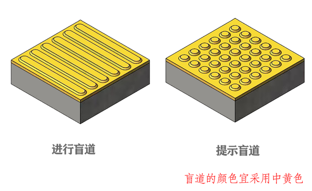 其中第4条 :盲道的颜色应与相邻的人行道铺面的颜色形成反差,并与周围景观相协调,宜采用中黄色,因为中黄色比较明亮,更易被发现。