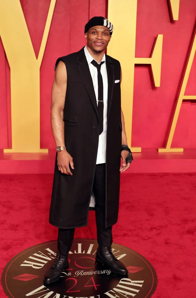 NBA 球星 Russell Westbrook 以无袖的 Thom Browne 礼服大衣出席 Vanity Fair 派对。