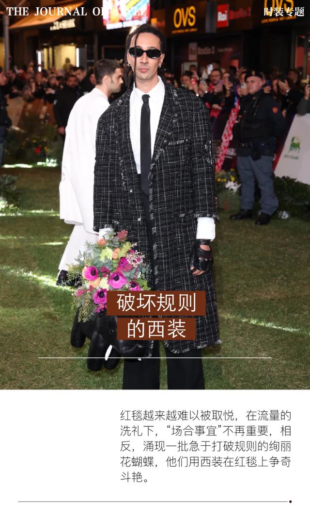 这不是一场空穴来风的致敬,或许在西装进化的近 20 年中,我们所见的合理红毯西装已经太多了,反而需要些许兴奋点来调剂西装的新形态。事实上,早于上世纪三十年代,西方曾发起过“the men’s dress reform party”男性衣着革命运动,其目的为破坏规则与束缚… 而社交媒体时代下的红毯也开始展现趣味的西装形态,在如今,红毯的西装着装文化愈显多元,这也暗示无需再单一拥护某种规则及价值观。
