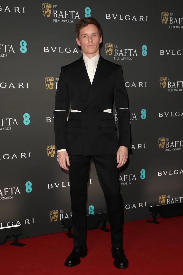Eddie Redmayne 穿着特殊剪裁的 Alexadner McQueen 西装,出席英国电影学院奖。