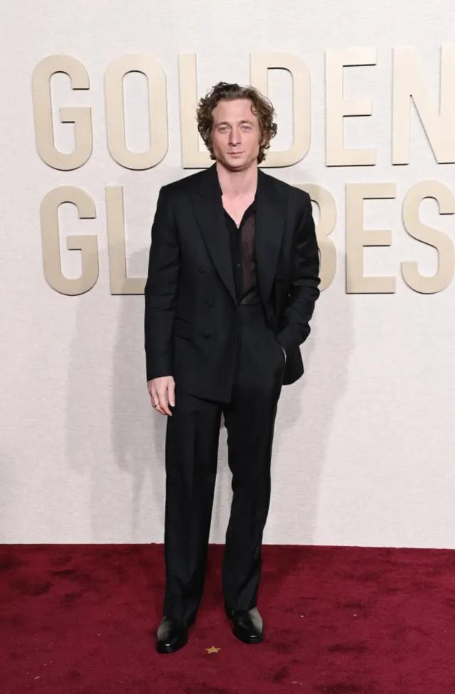 Jeremy Allen White 身穿 Calvin Klein 双排扣西装,内搭透视衬衫,出席金球奖红毯。