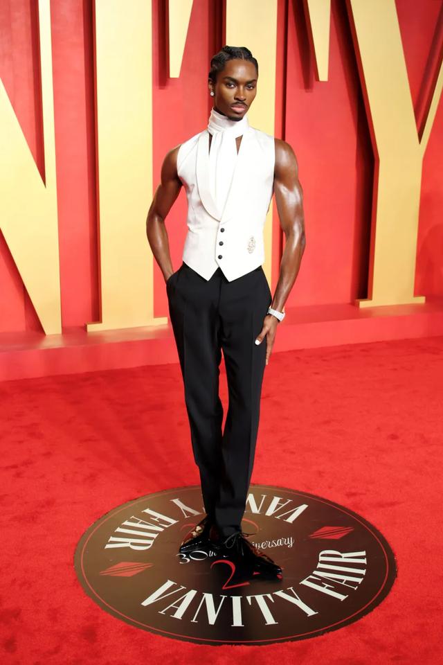 男模 Alton Mason 穿着无袖的 Dolce&Gabbana 马甲搭配丝巾,取代传统正装礼服出席 Vanity Fair 派对。