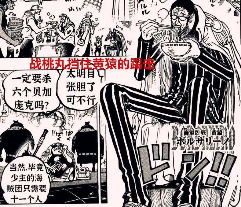 第二个重磅的消息是,战桃丸出来应战黄猿了,就在黄猿刚刚抵达蛋头岛的时候,战桃丸就挡住了他的一招踢击,战桃丸直接说,自己是世界上防御最强的男人。当战桃丸说出这句话的时候,就可以预料到后面的剧情发展了,防御最强的人跟光速男黄猿对决,看一下到底谁强谁弱,不过我感觉黄猿可能会放水,因为他跟战桃丸是好朋友,两人能不能认真打起来都很难说,但战桃丸能够挡住黄猿了踢击,也证明了他的战斗力不在黄猿之下。