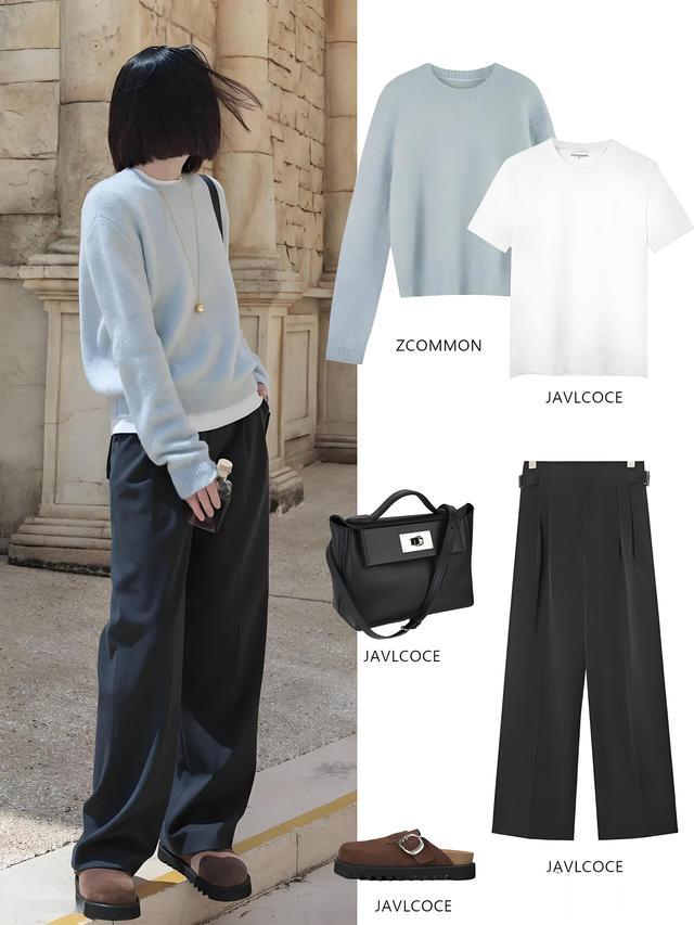 套头的浅蓝色毛衫,内部叠穿白色T恤,