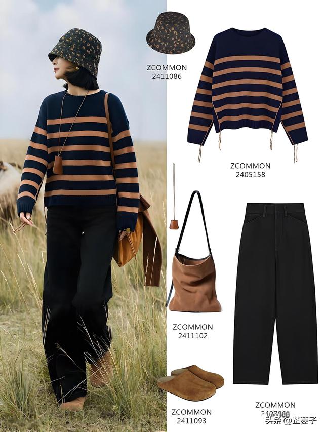 棕色的毛衫、用藏蓝色色条纹毛衫叠穿,在沉静中凸显一种活力,