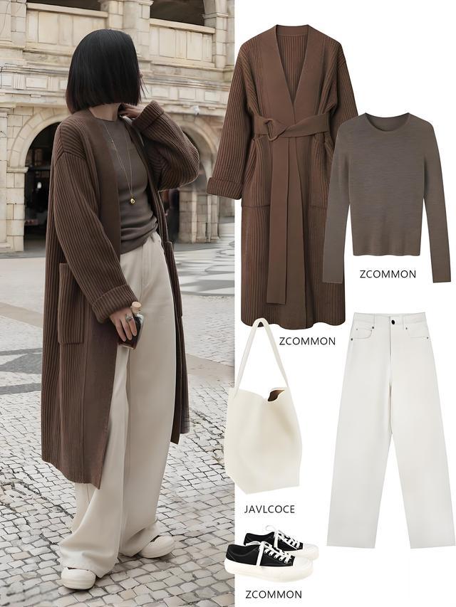 咖色的长款毛衣开衫,能很好的修饰身形,