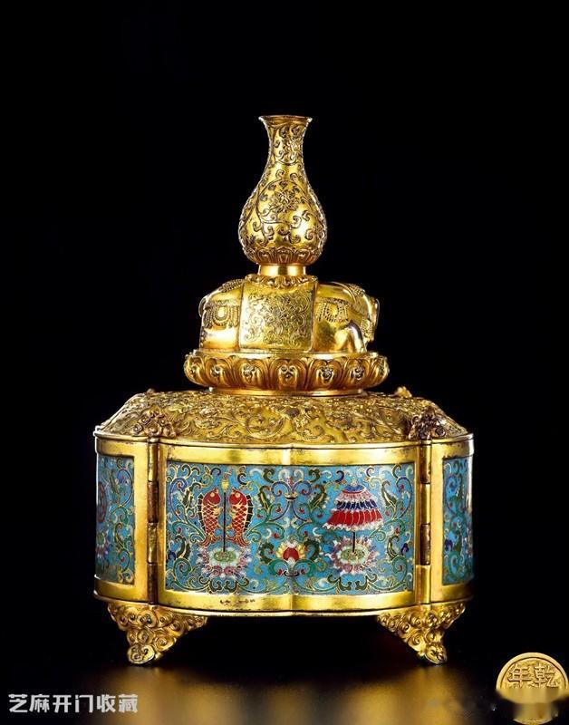 3:清乾隆铜胎掐丝珐琅太平有象八吉祥多宝盒,尺寸:高20.5厘米,成交价:RMB241.50万
