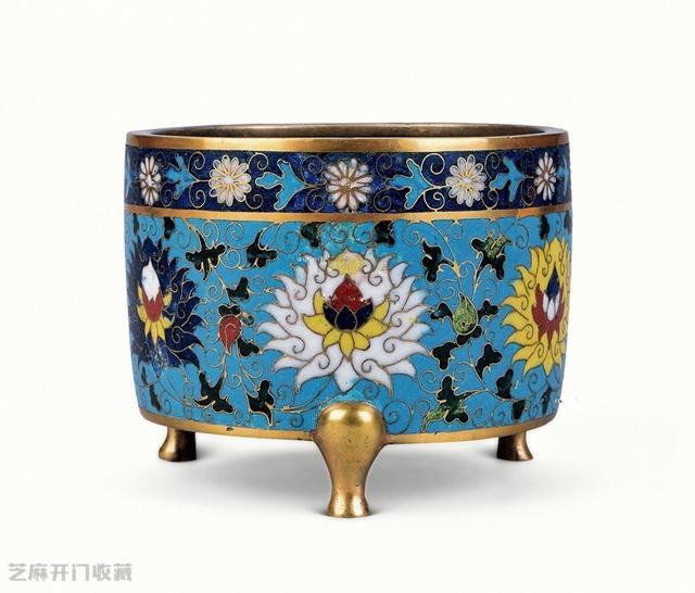 2:元铜胎掐丝珐琅缠枝莲纹三足炉,尺寸:直径13.3厘米,成交价:HKD283.20万
