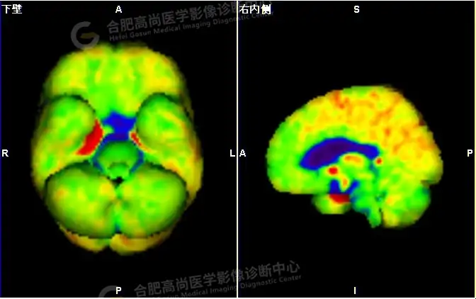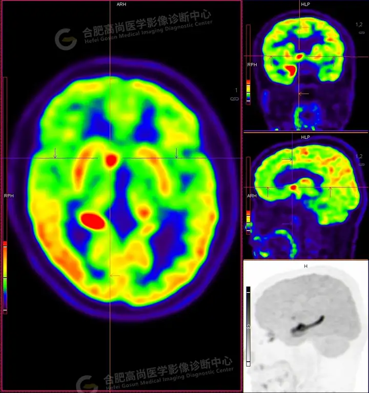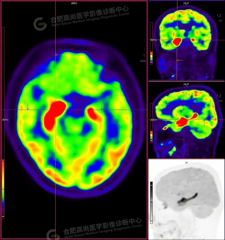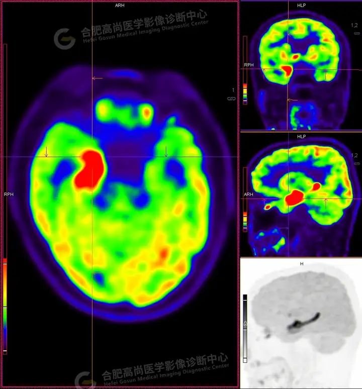 发作间期显像:PET显像双侧海马呈放射性摄取异常增高,以右侧明显,右侧海马SUVmax16.1、SUVavg4.4,左侧海马SUVmax7.3、SUVavg3.1(同层面额叶脑皮质SUVmax5.9、SUVavg2.3);CT示左侧海马体积较右侧似轻度缩小,左侧侧脑室颞角轻度增宽。PET显像右侧杏仁核及右侧基底节区局灶性放射性摄取异常增高,SUVmax14.1、SUVavg5.7(左侧SUVmax5.1、SUVavg3.6);CT示右侧杏仁核及右侧基底节区大小、形态正常,未见异常密度灶。