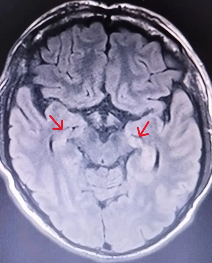 患者男, 58岁。2个月前无明显诱因下出现间断性记忆力减退、四肢抽搐,每次持续约10分钟,至今共发作6次。既往有肺结核病史。