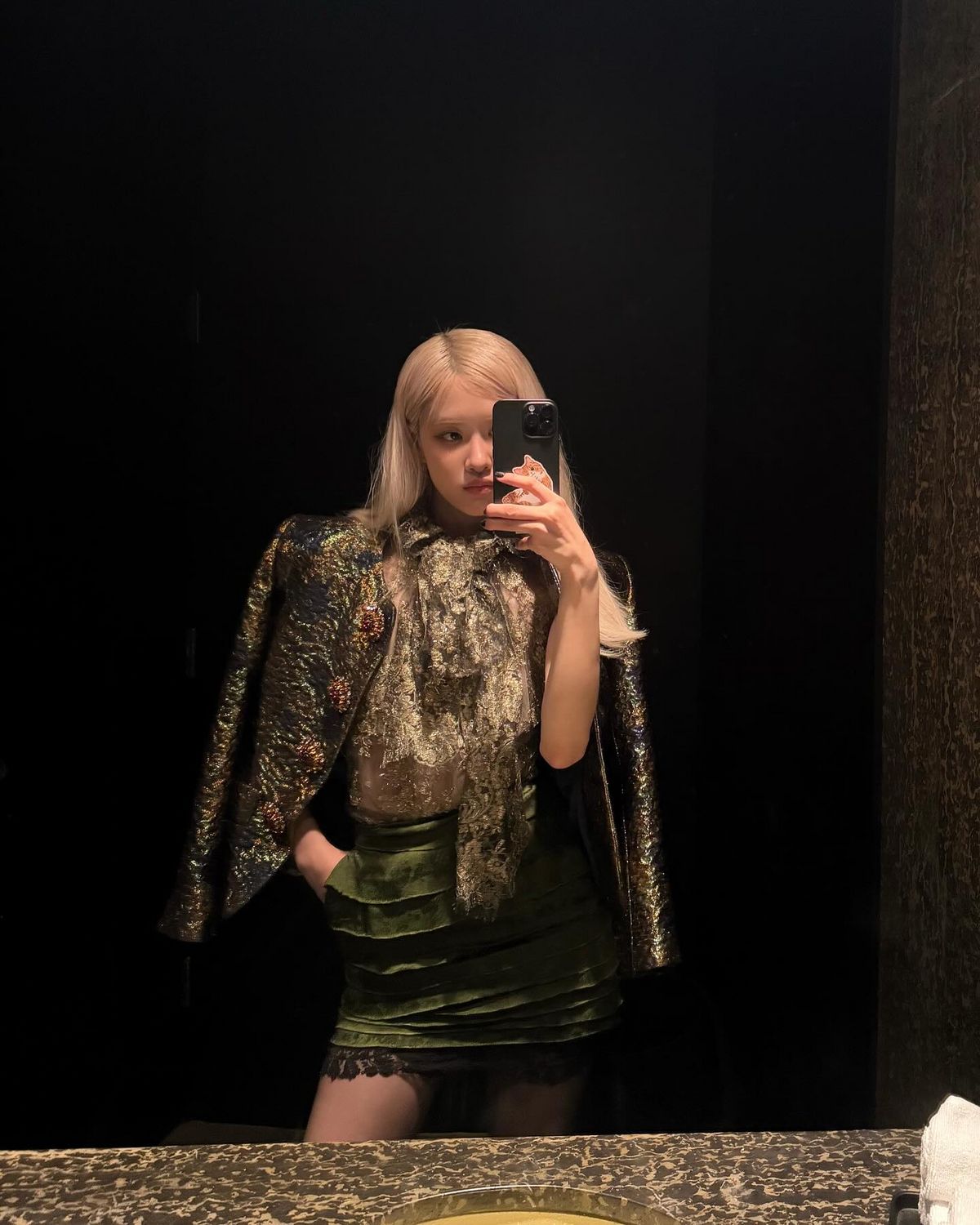在奥斯卡颁奖典礼前的晚宴上,Rosé以一袭Saint Laurent金色提花刺绣夹克惊艳四座。这件外套的精致华丽与她金色系带衬衫及墨绿色黑色蕾丝花边的迷你短裙相得益彰,不仅彰显了她的高贵气质,更在星光熠熠的好莱坞晚宴上成为了最亮眼的存在。这样的穿搭,无疑是晚宴等正式场合的最佳选择。