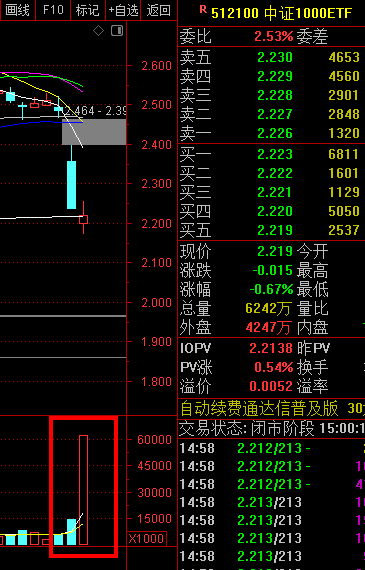 如果一但回补,估计上证这边也得回来。最好的局面就是,原地在这里筑底。从目前的情况来判断,到也不是没可能性。去年1月那波,就是中证1000ETF放大量见的底:
